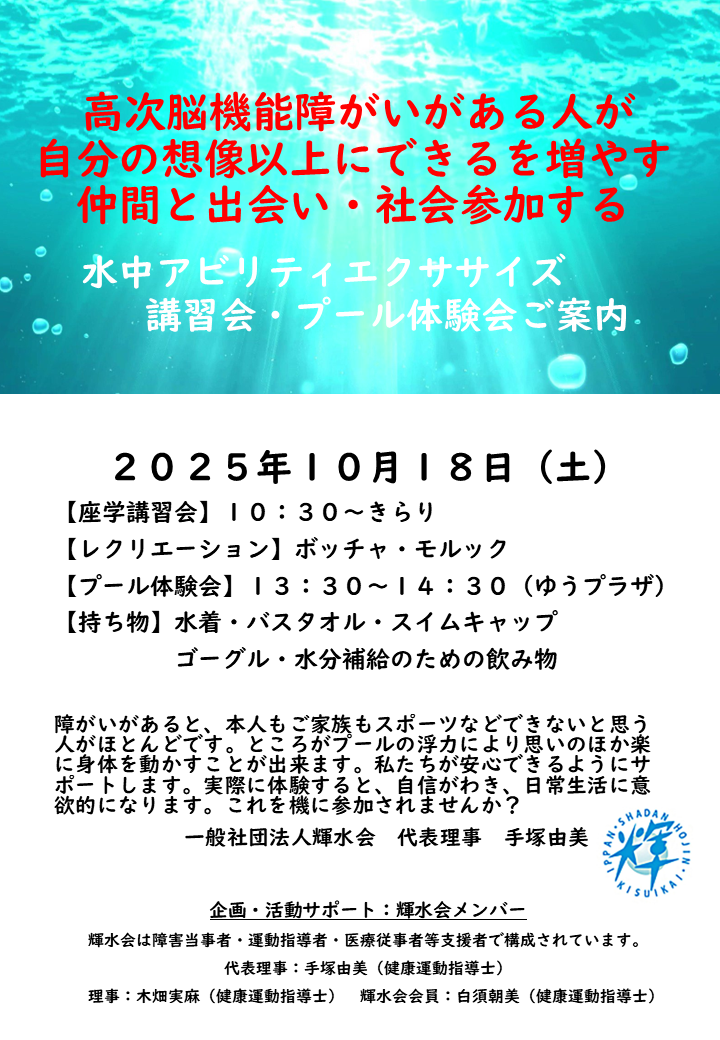 輝水会では水中活動の取り組みに一緒にプールに入り水中リラクゼーションやエクササイズの介助をするサポーターを募集しています
