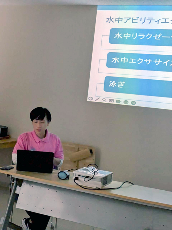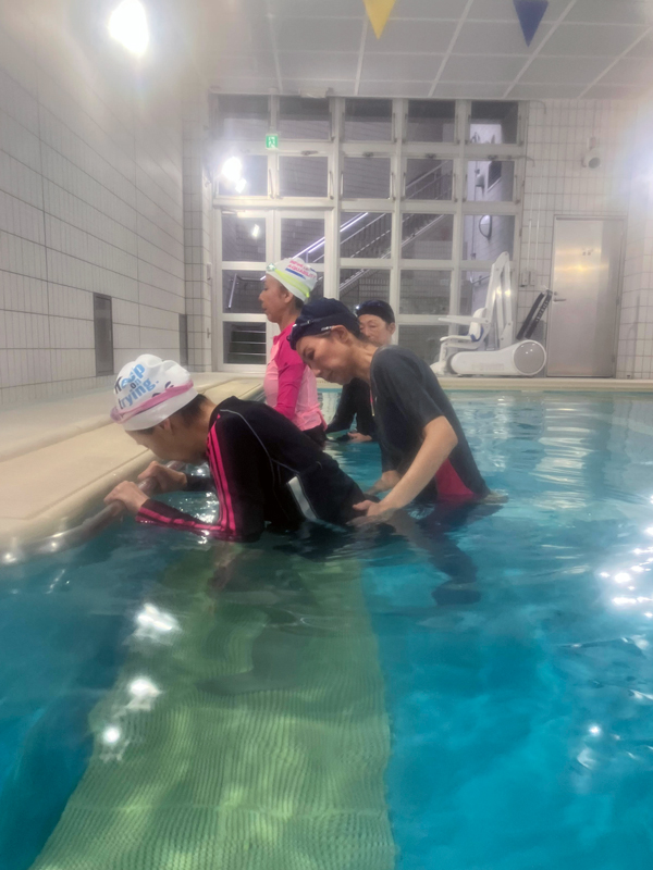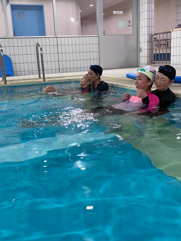 入水から水中リラクゼーションを行う流れや、互いに支える側、支えられる側を体験しながら、対象者が力が入っている場合の声掛けやヌードル(浮具)を利用してサポート側もより負担なく行う方法などを繰り返し練習しました。