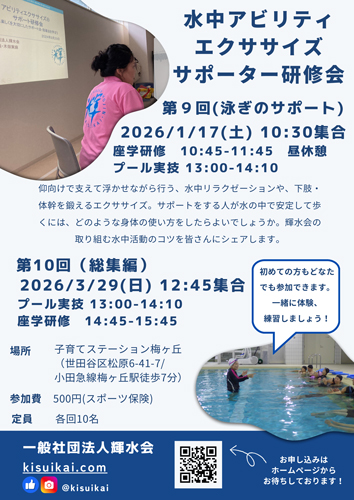 今回の9回目の研修会は、泳ぎのサポートを中心に行います。初めての方もどなたでも参加できます。一緒に体験、練習しましょう。